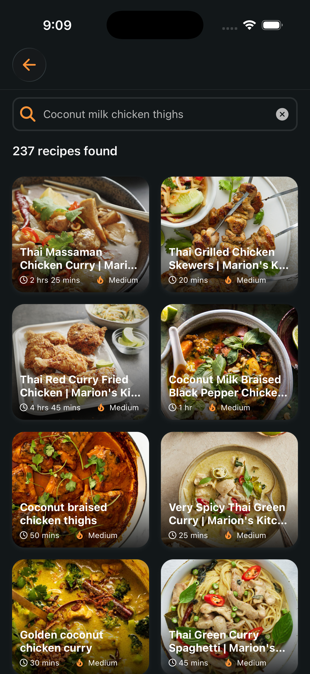 The scenario: it's mid-week, you have half a can of coconut milk, a bunch of cilantro that needs using, and some chicken thighs. Without a system, you either Google desperately, order out, or let the ingredients go to waste. With Seasoned, you type "coconut milk chicken" and get back every recipe in your collection โ and in the full database โ that uses those ingredients.